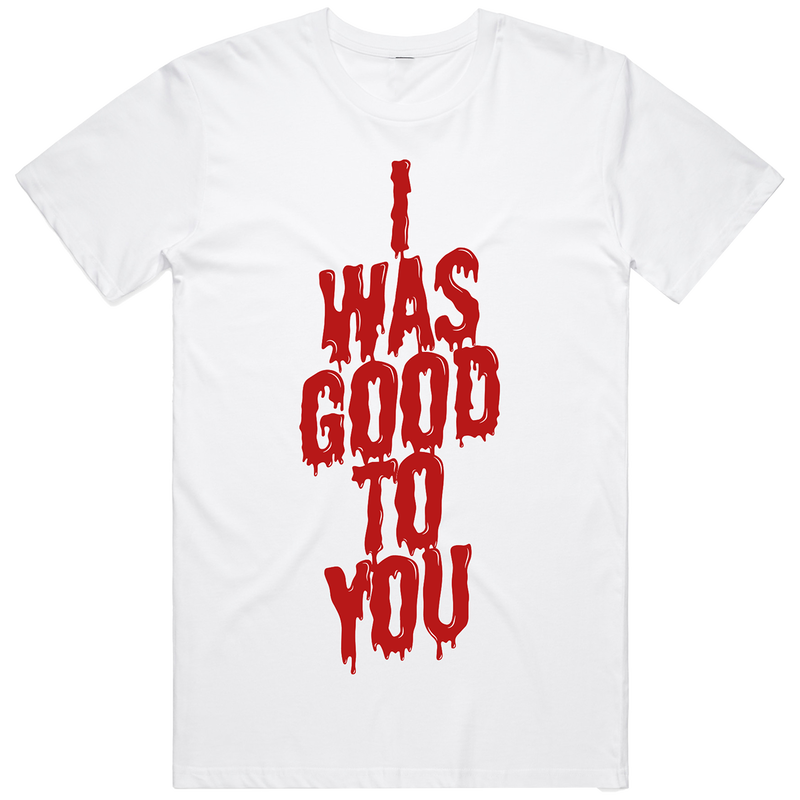 White t-shirt with 'I Was Good To You' print to the front. Regular fit, midweight 100% cotton garment.
