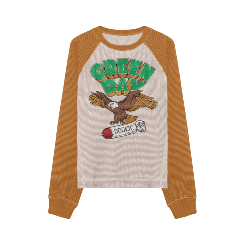 Printed on a heavyweight 7.5oz waffle knit thermal raglan. Cream colored body, caramel brown trim. 100% cotton, made in USA.