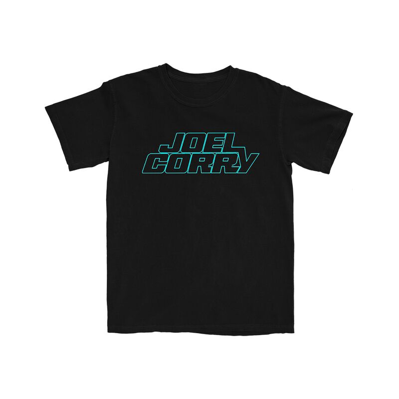 Joel Corry blue outline logo on a gildan black 100% Combed ringspun cotton.