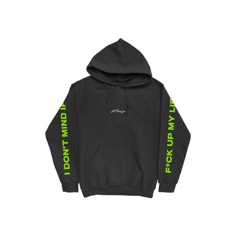 The All Time Low 'Monsters Square Hoodie' features a white 'All Time Low' logo on the front of the shirt. The back features four images of the band members as monsters on green backgrounds. The sleeves feature the words 'I don’t mind if u f*ck up my life' in green. This design is printed on a black hoodie.