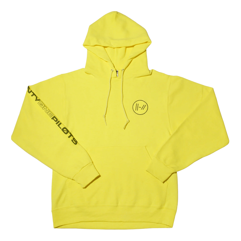 The twenty one pilots Embroidered Logo Hoodie here features the band logo embroidered on the front of this yellow hoodie. The band name is printed along the right sleeve. The design is printed on a yellow hoodie, 100% cotton.