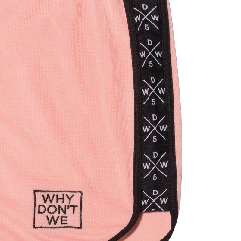 The Why Don't We Panel Shorts (Pink) here are a custom made 100% Polyester short. The band logo is embroidered at the bottom of the left leg. The sides of the shorts have a custom WDW5 Cross logo sewn into them.